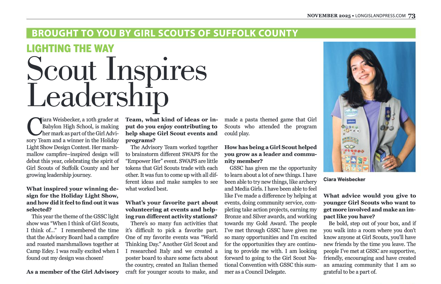 Ciara Weisbecker, a 10th grader at Babylon High School, is making her mark as part of the Girl Advisory Team and a winner in the Holiday Light Show Design Contest. Her marshmallow campfire-inspired design will debut this year, celebrating the spirit of Girl Scouts of Suffolk County and her growing leadership journey.