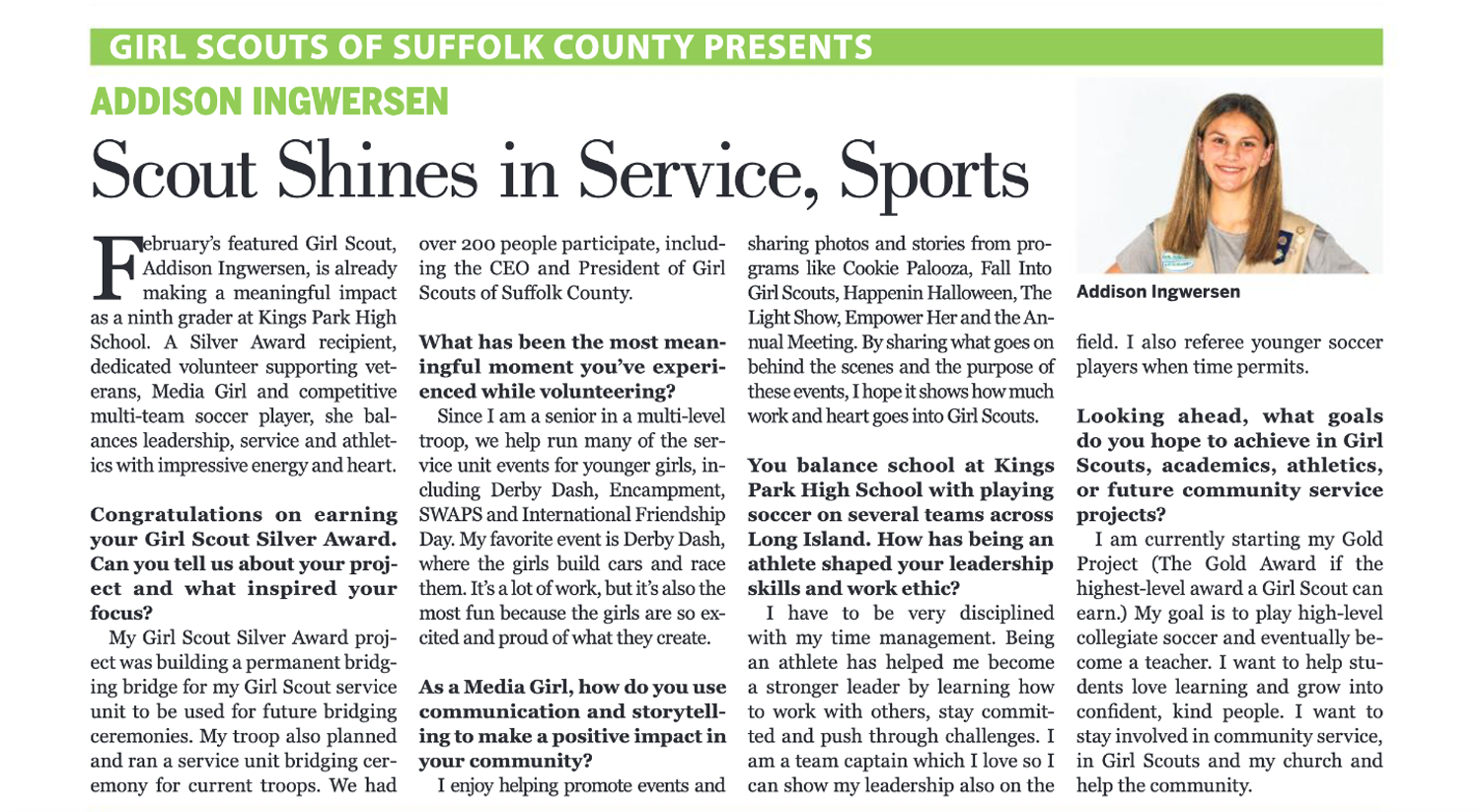 February’s featured Girl Scout, Addison Ingwersen, is already making a meaningful impact as a ninth grader at Kings Park High School. A Silver Award recipient, dedicated volunteer supporting veterans, Media Girl, and competitive multi-team soccer player, she balances leadership, service, and athletics with impressive energy and heart.